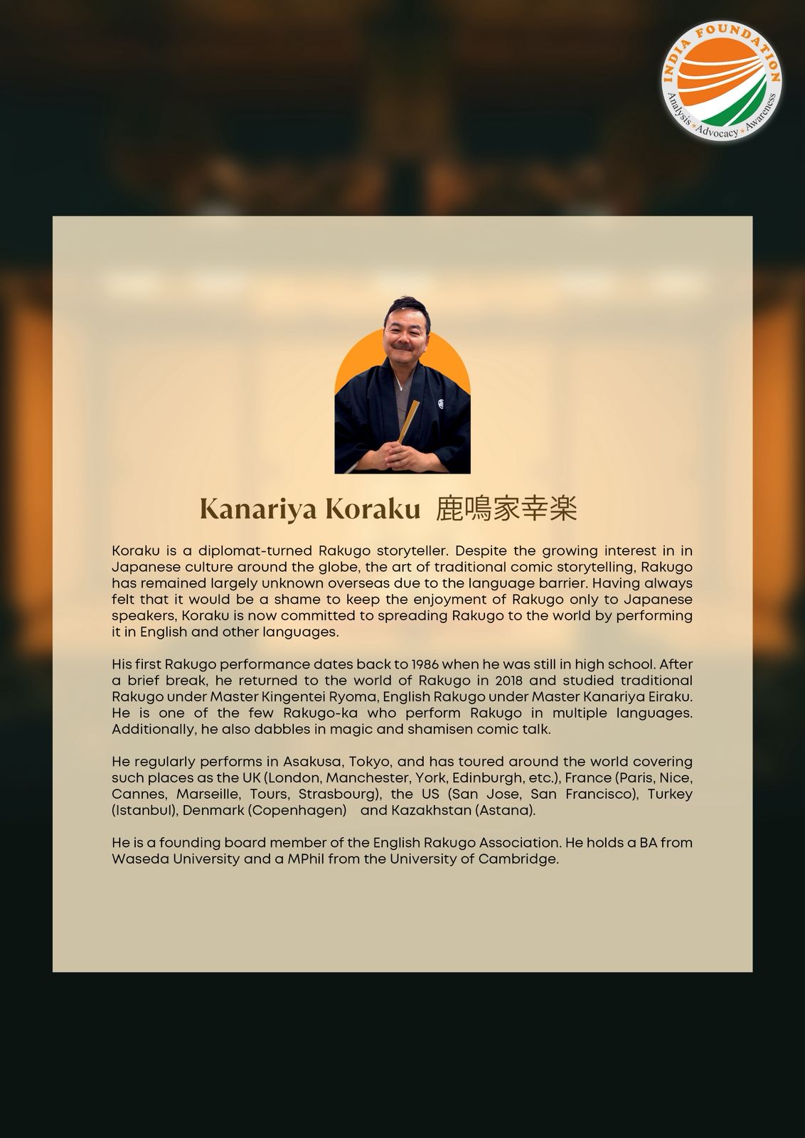 India Foundation invites you to the 9th Katha Session, featuring KANARIYA Koraku (鹿鳴家幸楽)—a diplomat-turned Rakugo storyteller bringing Japan’s 400-year-old comic storytelling tradition to life.